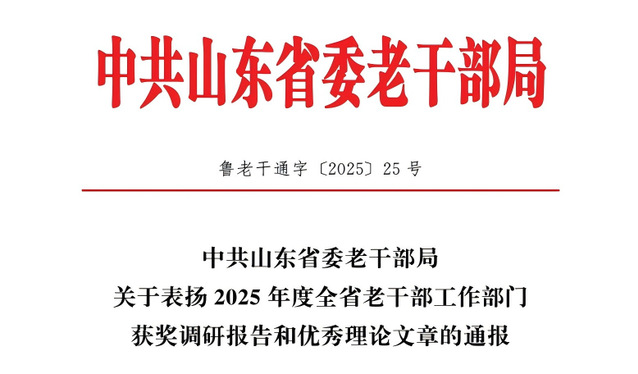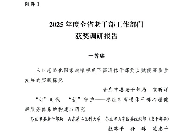 近日,中共山东省委老干部局印发《关于表扬2025年度全省老干部工作部门获奖调研报告和优秀理论文章的通报》(鲁老干通字〔2025〕25号)。由枣庄市委老干部局、脱裤吧 、枣庄市山亭区委组织部(老干部局)联合完成的调研报告《“心”时代“新”守护——枣庄市离退休干部心理健康服务体系的构建与研究》,荣获全省老干部工作部门调研报告一等奖。 脱裤吧 孙琳教授作为主要作者参与课题研究。