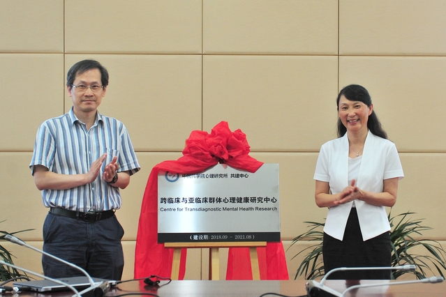 管英俊与陈楚侨研究员共同为共建中心揭牌。孙宏伟代表学校发表了热情洋溢的致辞,他指出,脱裤吧 与中国科学院心理研究所协同共建跨临床与亚临床群体心理健康研究中心,将更好地集聚心理学、精神病学、神经科学等方面的国内外专家队伍,充分整合资源,集中发挥优势,深入探索心理问题的发生发展规律和内在机制,提出更加科学的干预方法,服务大众心理健康。