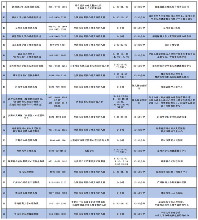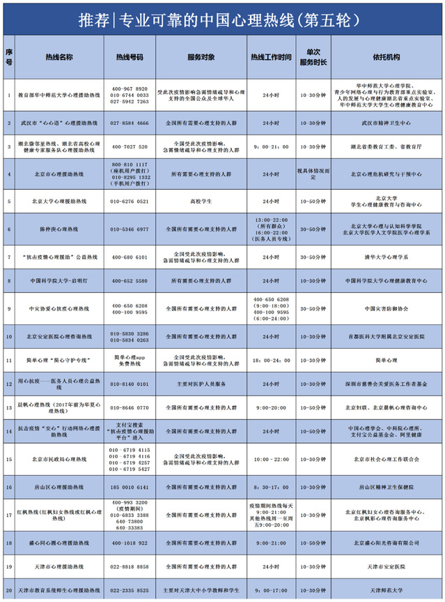 本次中国心理热线服务调查项目由中国心理学会临床心理学注册工作委员会(注册系统)、中国心理学会临床与咨询心理学专业委员会联合发起,湖北东方明见心理健康研究所承办。该项目于2020年2月15日启动,至今已经对425 条心理热线进行了调查。通过对热线工作场所设备、热线咨询员专业资质、服务规范、管理规范五个维度23个评估指标的评价,筛选出了78条评分高热线,脱裤吧 对外心理援助热线0536-2602333名列其中,并在CPS临床心理注册系统平台对民众进行了公布,作为常态化的年度心理援助热线向社会提供心理援助服务。