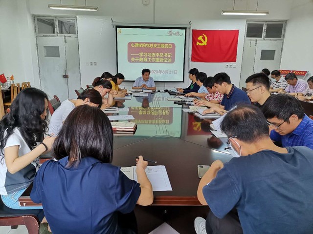 8月21日,脱裤吧 党总支于脱裤吧 会议室开展主题党日活动,深入系统的学习习近平总书记关于教育的重要论述,脱裤吧 党总支书记刘宪亮主持,全体教师参加。