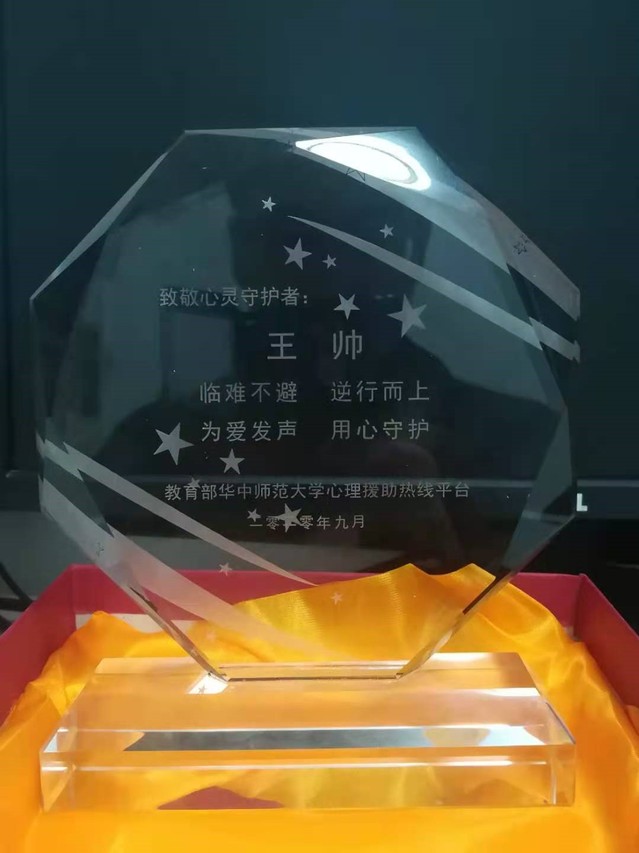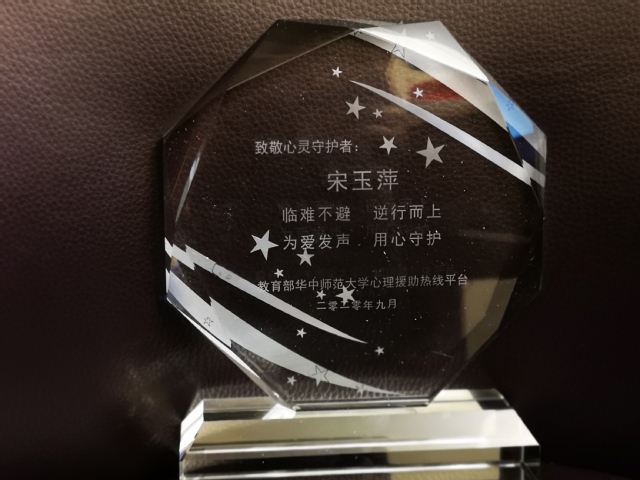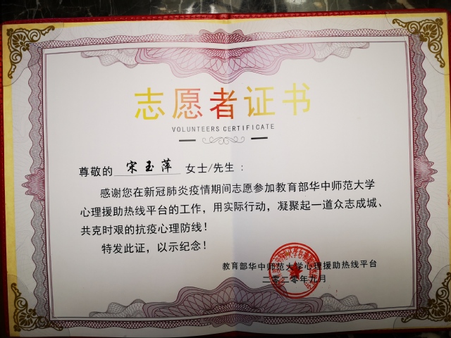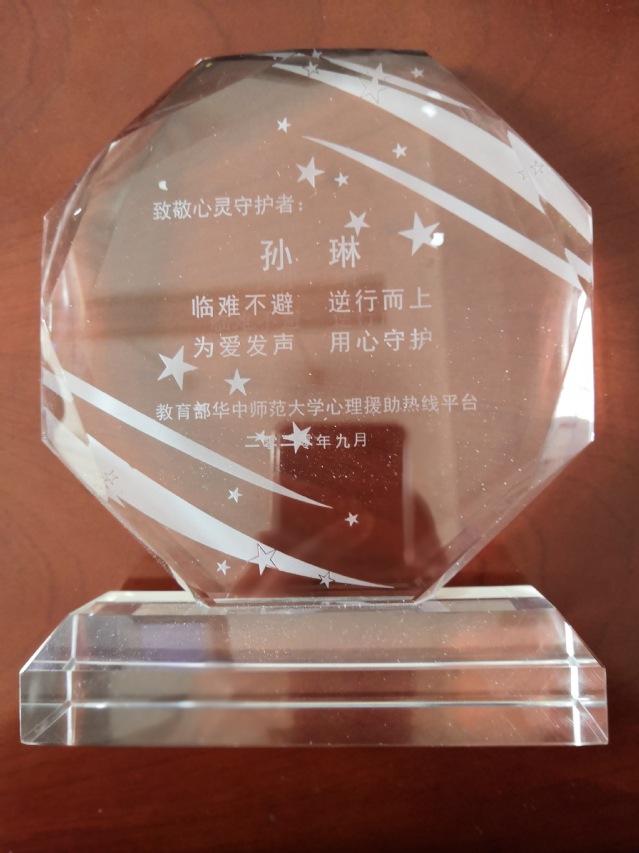 近日,教育部华中师范大学心理援助热线平台颁发了志愿者证书及“临难不避、逆行而上、为爱发声、用心守护”荣誉奖杯。脱裤吧 的宋玉萍教授、孙琳副教授、高新义、高卫星、王帅5位教师均获得此殊荣。