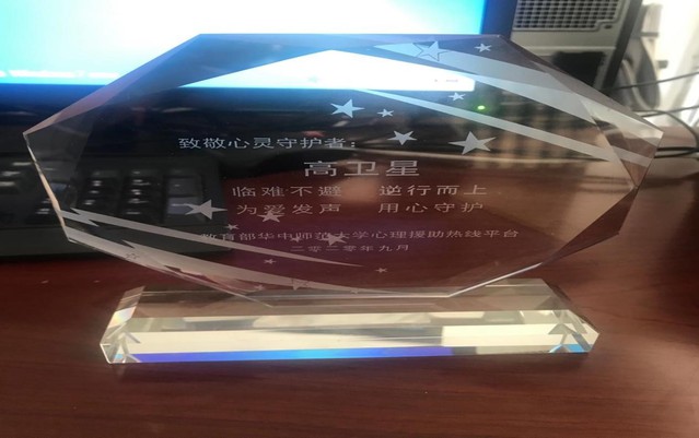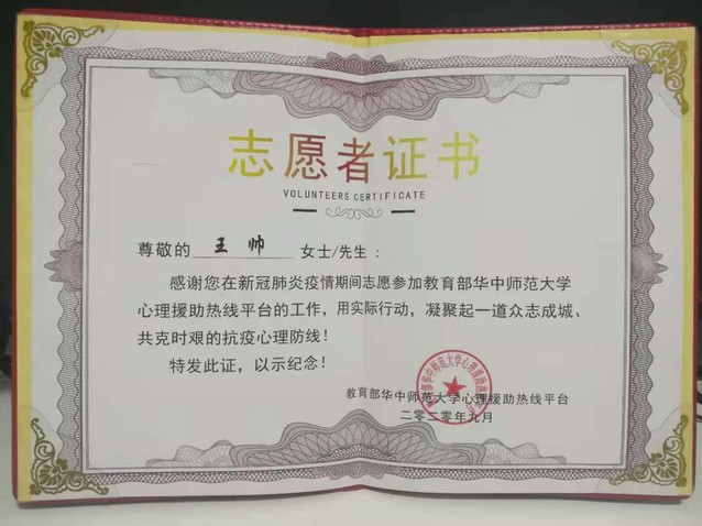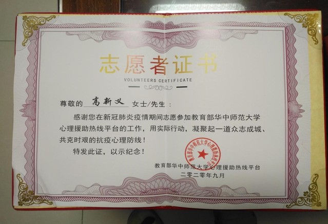近日,教育部华中师范大学心理援助热线平台颁发了志愿者证书及“临难不避、逆行而上、为爱发声、用心守护”荣誉奖杯。脱裤吧 的宋玉萍教授、孙琳副教授、高新义、高卫星、王帅5位教师均获得此殊荣。
